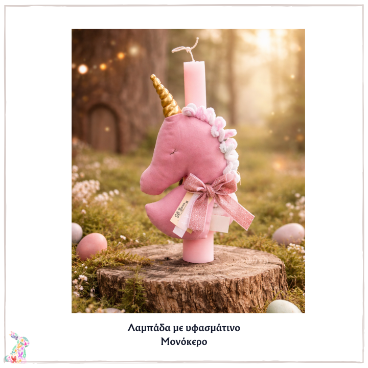 ✦ Χειροποίητη αρωματική λαμπάδα διακοσμημένη με πάνινο μονόκερο σε ροζ αποχρώσεις, ιδανική για κορίτσια και για ένα ξεχωριστό πασχαλινό δώρο.
