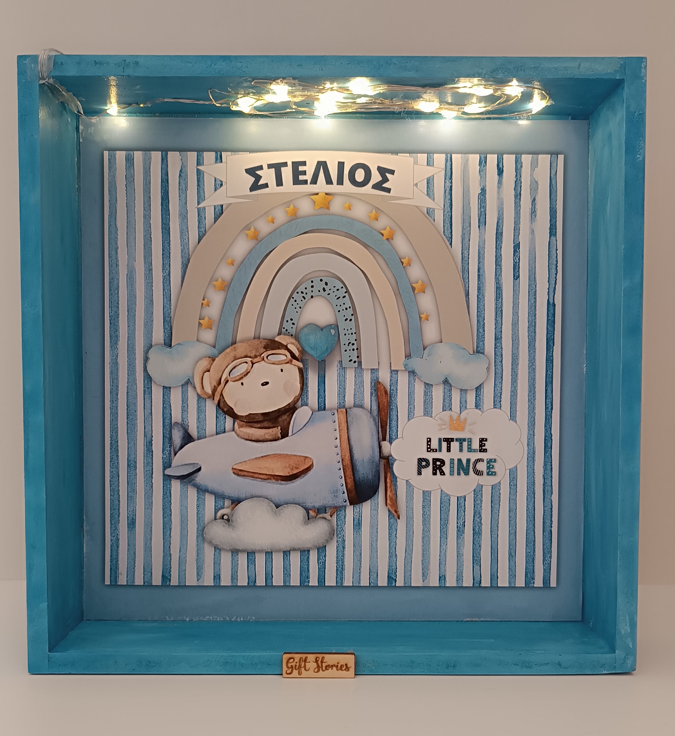 Δημιουργούμε για σας με πολλή-πολλή αγάπη ένα ξεχωριστό Ξύλινο Φωτιζόμενο Κάδρο Γαλάζιο Αεροπλάνο με μια όμορφη παράσταση. Ο μικρός μας αρκούδος σε γαλάζιο αεροπλάνο. Περιέχει απαλό led φως ιδανικό για το παιδικό δωμάτιο που θα ξετρελάνει τα παιδιά σας! Μπορείτε να το συνδυάσετε μοναδικά και με ξύλινη κρεμαστή ταμπέλα του ίδιου θέματος.