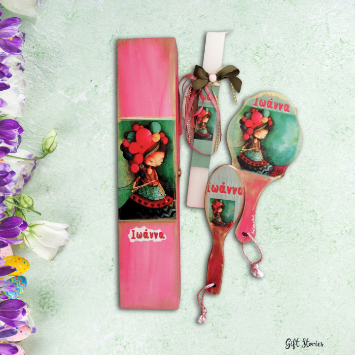 Το σετ αποτελείται από την λαμπάδα, τον καθρέπτη, την βούρτσα και τοποθετούνται μέσα σε ξύλινο κουτί του ίδιου θέματος. Το θέμα είναι το “Κοριτσάκι” και αυτό που το κάνει ξεχωριστό, είναι η αναγραφή του ονόματος της μικρής σας σε όλο το σετ δώρου.