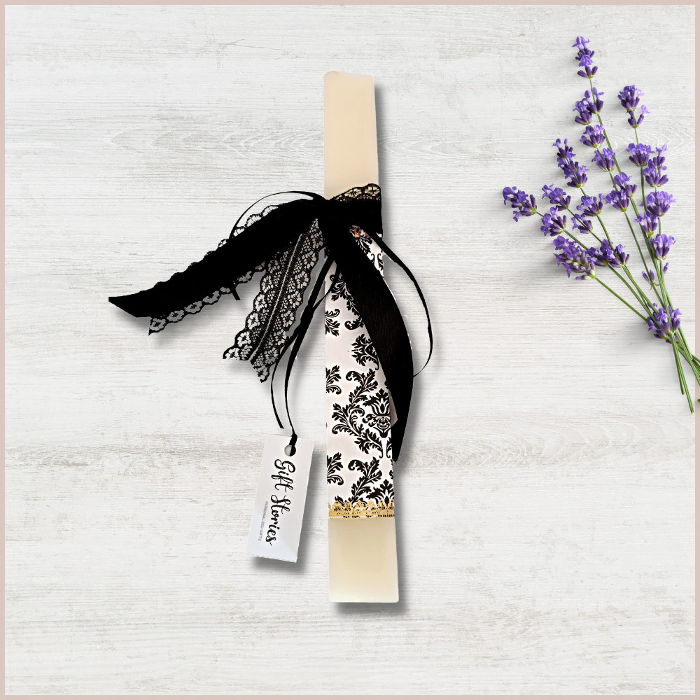 Οι Πασχαλινές χειροποίητες λαμπάδες για μεγάλους είναι ξεχωριστές και πρωτότυπες. Είναι φτιαγμένες απο λευκό αρωματικό κερί και απεικονίζουν μια vintage μαύρη δαντέλα. Ιδανική για μικρές και μεγάλες κυρίες.