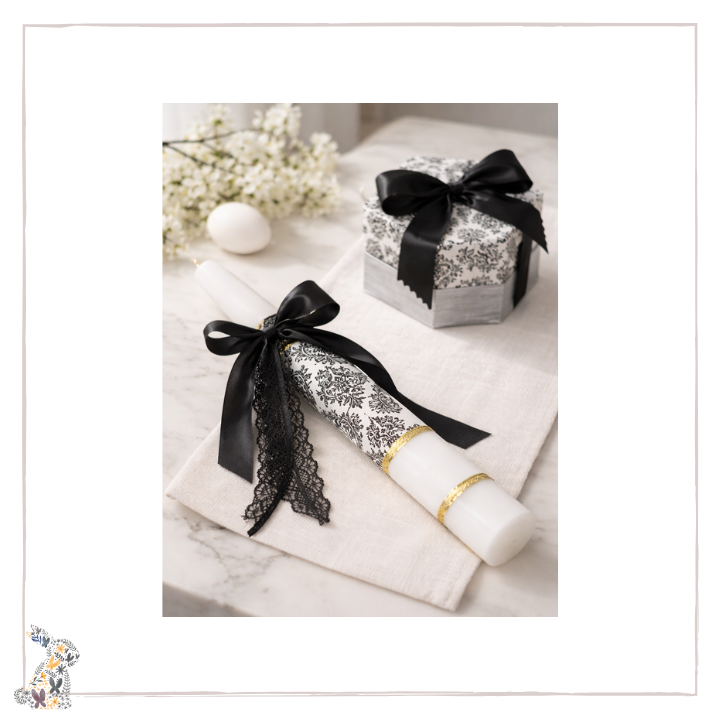 Οι Πασχαλινές χειροποίητες λαμπάδες για μεγάλους είναι ξεχωριστές και πρωτότυπες. Είναι φτιαγμένες απο λευκό αρωματικό κερί και απεικονίζουν μια vintage μαύρη δαντέλα. Ιδανική για μικρές και μεγάλες κυρίες.